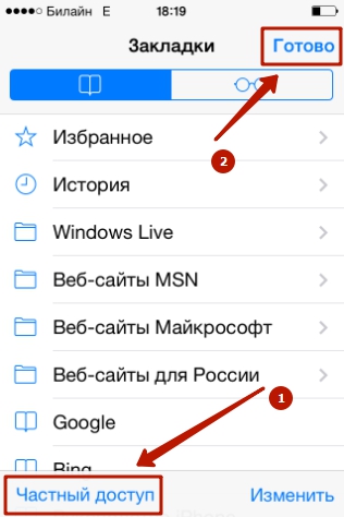 Если вы не желаете, чтобы адреса сайтов, которые вы посещаете, оставались в памяти мобильного устройства, пользуйтесь «Частным доступом ». Запросы после активации «Частного доступа » тоже сохраняться не будут. Включать функцию «Частный доступ » нужно в меню «Закладки » — достаточно просто кликнуть на одноимённую кнопку в левом нижнем углу, затем нажать «Готово ».